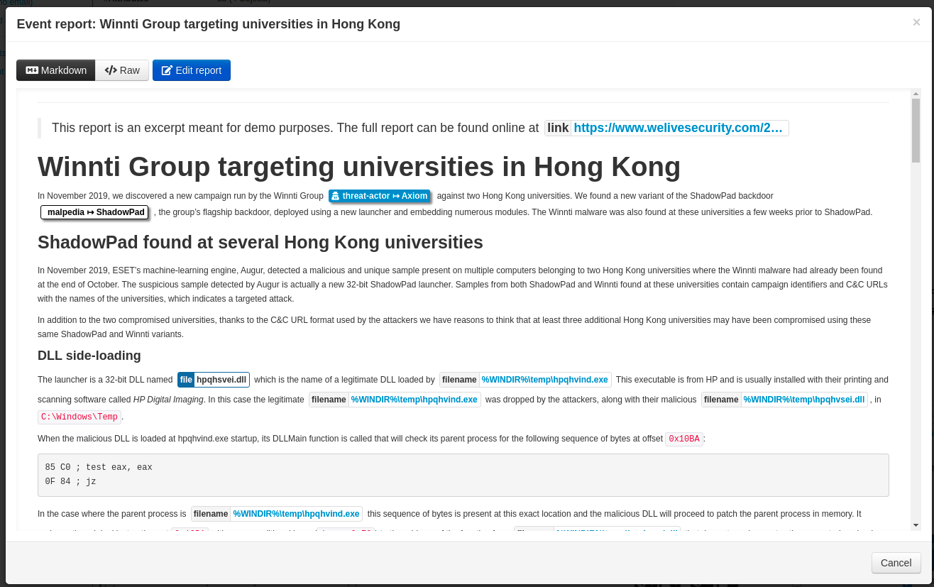 In the previous version of MISP, the new Event Report functionality has been introduced to edit, visualise and share reports in Markdown format, which includes the ability to reference elements from within a MISP event.